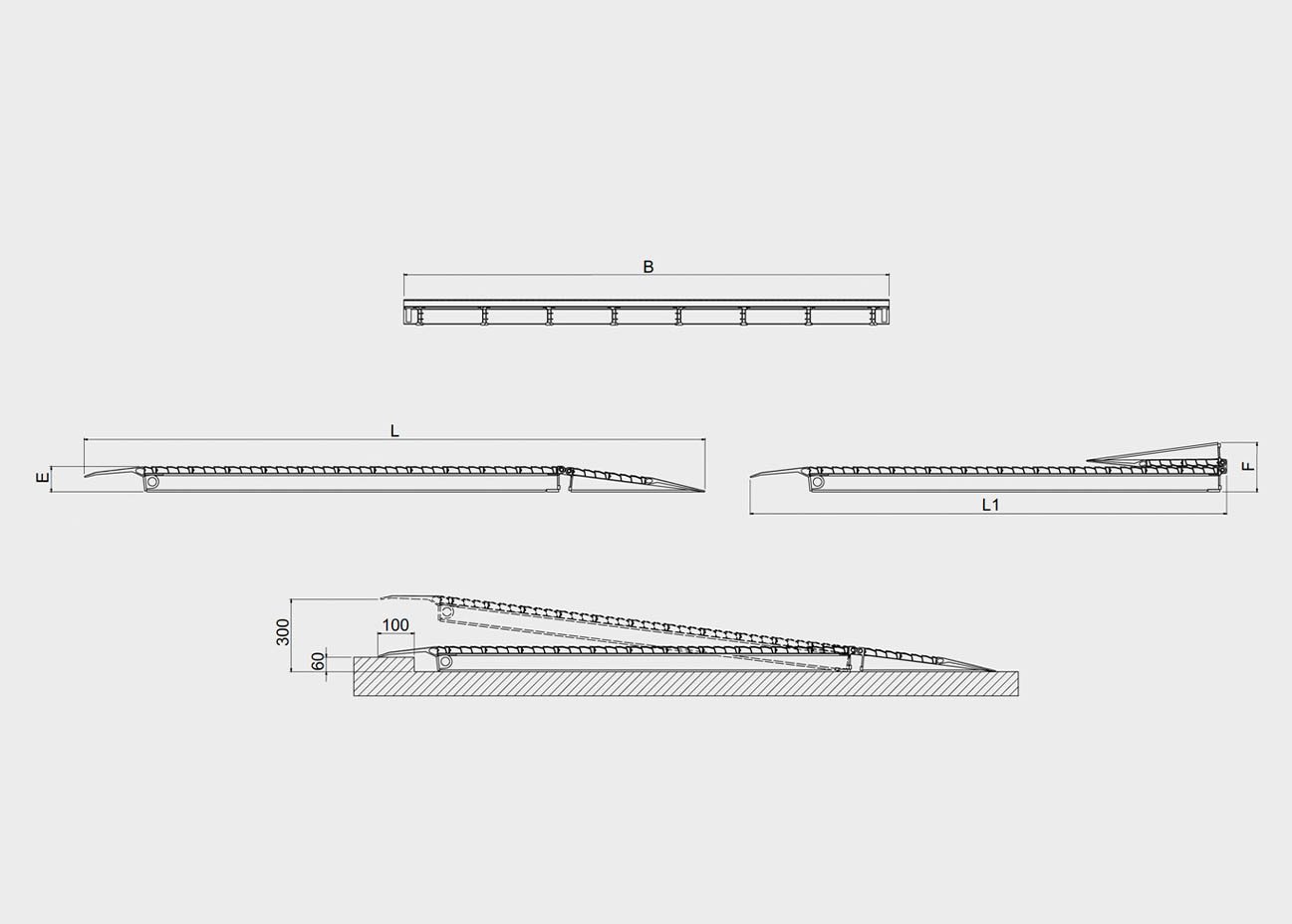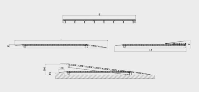| Modelis | Prekės kodas | Keliamoji galia (kg) su 1000 mm ratų baze | Ilgis L mm | Sulankstytos rampos ilgis L1 mm | Plotis B mm | Rampos matmuo E mm | Sulankstytos rampos matmuo F mm | Min./maks. pakrovimo aukštis mm | Svoris kg |
